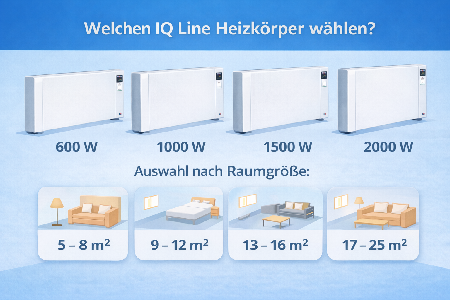 Entdecken Sie das komplette Sortiment der elektrischen Heizkörper IQ Line oder besuchen Sie unseren Ratgeber, in dem wir erklären, wie Sie den richtigen elektrischen Heizkörper auswählen und welche Lösung für Ihre Räume am besten geeignet ist.